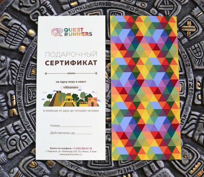 Желаете сделать незабываемый сюрприз своим близким? Подарочный сертификат с открытой датой на квесты «Юкатан», «Апокалипсис», "Канкун" и "Теотиуакан" – это отличная возможность провести время с друзьями, ощутить дух настоящего приключения, испытать свою смекалку и сообразительность!